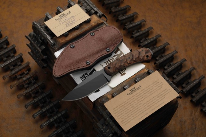 The Winkler Woodsman Fixed Blade Knife, proudly made in the USA, combines a compact, lightweight design with exceptional balance. Its upward-angled tip enhances the cutting edge, making it ideal for slicing tasks. Crafted by Daniel Winkler, a former U.S. Army Special Forces member who became a full-time bladesmith in 1988, this knife captures the essence of the American West. Favored by elite units like the Navy SEALs, it boasts an intricately carved Indian maple handle and a tactical, silent sandwich-style sheath. This popular WK design is perfectly balanced, making it versatile for a wide range of applications. A must-have for outdoor enthusiasts and tactical users, this knife is essential for any knife aficionado.